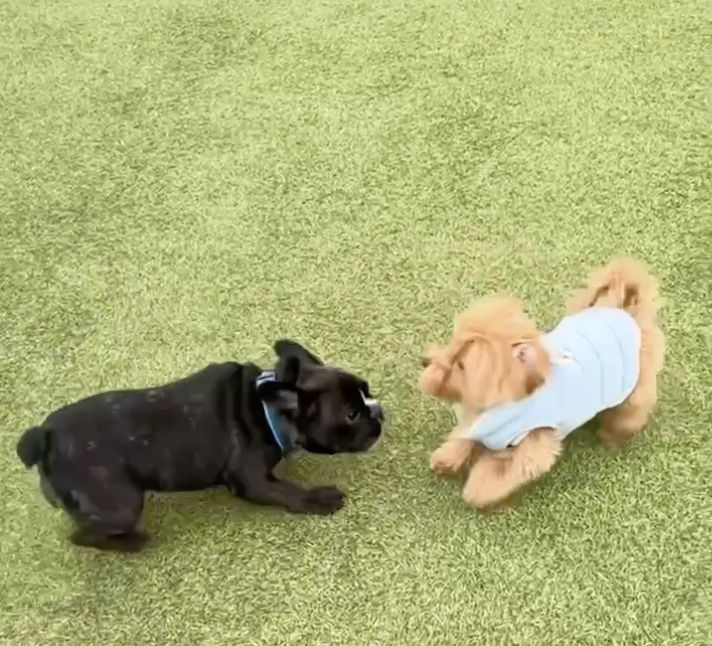 ドッグランで他の犬と遊ぶ小型犬の様子